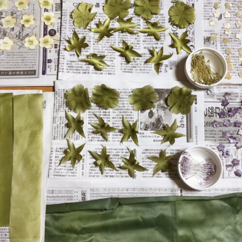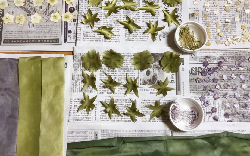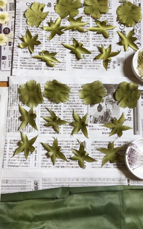 昨日から、『ミモザ』のパーツつくりを始めました。 染めや葉っぱのカットなどの下準備は、 【個展用】制作していた分から分けてもらったので大丈夫。 花はこ...